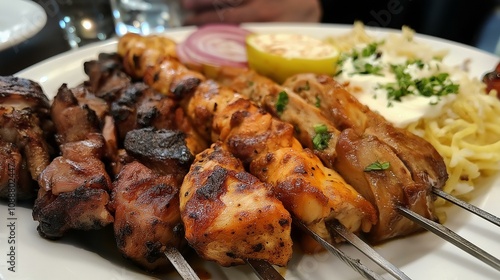 Delicious assortment of grilled skewers with various meats served on a platter with fresh sides.