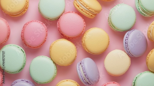Delicious assortment of pastel-colored french macarons is lying on a pink surface, creating a visually appealing culinary background