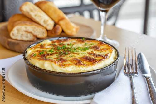 Delicious baked cheese meal with cutlery and bread on a table for lunch
