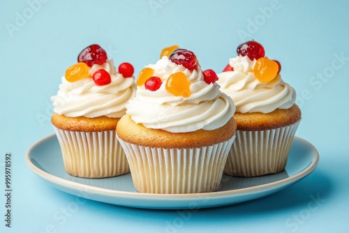Delicious baked cupcakes topped with sweet white frosting decorated with candied fruits served on plate on blue background in studio with generative ai