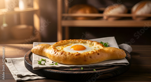 Delicious Baked Georgian Khachapuri With Sunny Side Up Egg Served On Wooden Platter