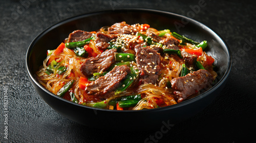 Delicious Beef Japchae in Black Bowl