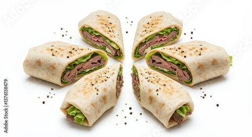Delicious Beef Wraps with Lettuce and Pepper on White Background