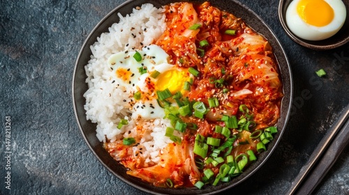 Delicious Bibimbap Bowl with Rice, Kimchi, and Soft Boiled Egg