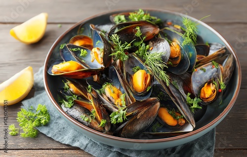 Delicious Boiled Mussels, a culinary delight, served in a bowl with fresh herbs and lemon wedges. A simple yet elegant seafood dish.