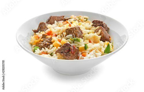 Delicious boiled rice with meat and vegetables in bowl on white background