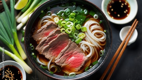 Delicious bowl of beef noodle soup with fresh green onions and sauces
