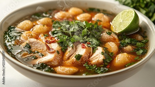 Delicious bowl of chicken soup with herbs and lime, served on a white table