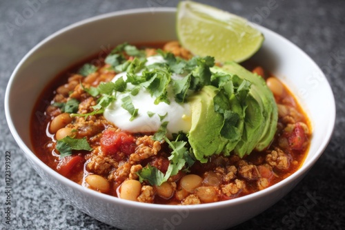 Delicious bowl of chili with avocado, sour cream, and lime garnish