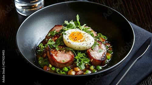 Delicious bowl of gourmet pork dish with a soft-boiled egg, fresh herbs, and rich broth on elegant table