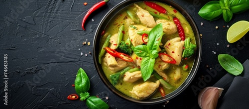 Delicious bowl of savory chicken curry with a vibrant red pepper garnish and spoon