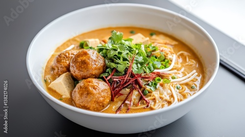 Delicious Bowl of Savory Meat and Noodles Garnished with Fresh Herbs