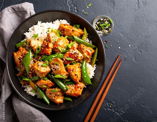 Delicious bowl of sesame ginger chicken stir-fry garnished with fresh vegetables and herbs
