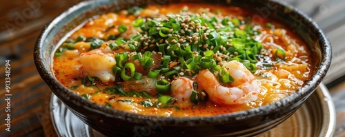Delicious bowl of spicy shrimp soup topped with fresh green onions and herbs, perfect for warming meals.