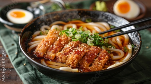 Delicious bowl of udon noodles with crispy fried chicken, garnished with scallions and sesame seeds, perfect for an appetizing meal.