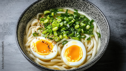 Delicious bowl of udon noodles with soft boiled eggs, green onions, and sesame seeds