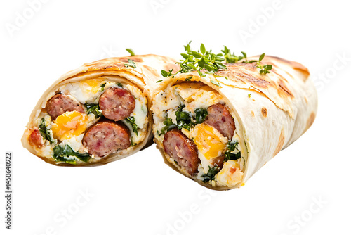 Delicious Breakfast Burrito with Sausage Eggs and Greens on transparent background