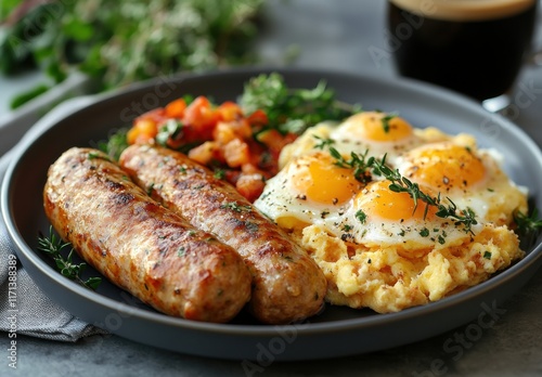 Delicious Breakfast Platter Featuring Savory Sausages, Scrambled Eggs, and Flavorful Vegetables Surrounded by Fresh Herbs and a Cup of Coffee