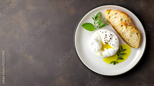 Delicious Breakfast with Poached Egg Sliced Bread Fresh Herbs and Olive Oil on White Plate against Textured Brown Background