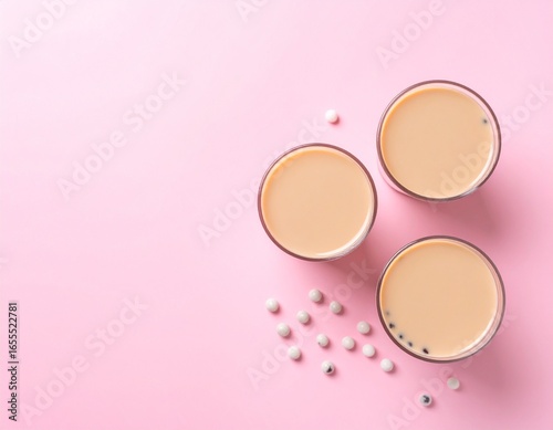 Delicious Bubble Milk Tea Glasses with Tapioca Pearls on Pink Background