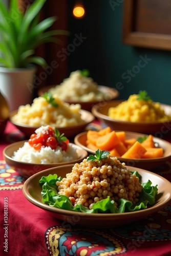 Delicious buffet spread of international cuisine on colorful tablecloth, diverse, presentation, multicultural