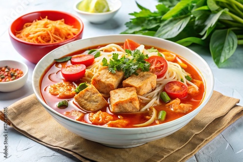 Delicious Bun Rieu Vietnamese Soup - Crab Paste Vermicelli with Shrimp & Tofu - Appetizing Photo
