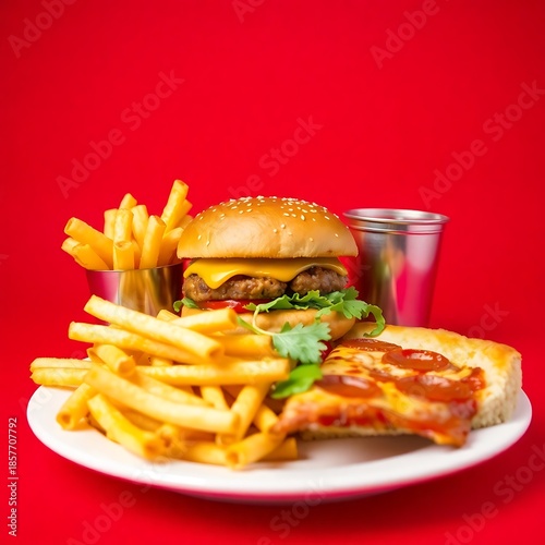 Delicious burger, fries, and pizza slice
