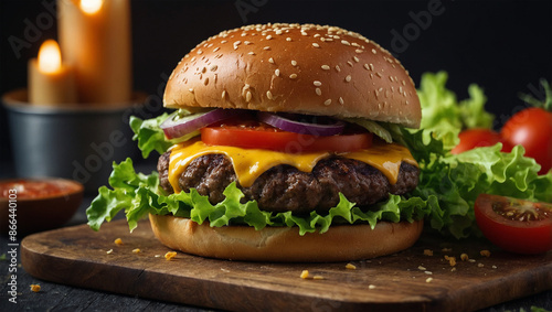Delicious burger with beef, melted cheese, fresh lettuce and thick tomatoes.