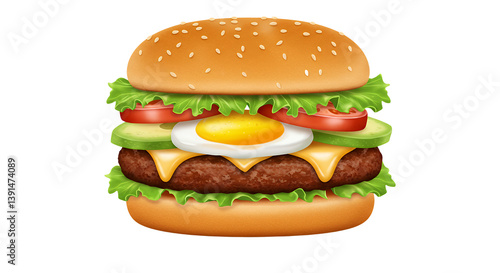 Delicious Burger with Fried Egg Cheese and Fresh Vegetables Isolated