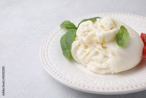Delicious burrata cheese and basil on light table, closeup. Space for text
