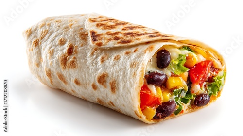 Delicious burrito with black beans corn lettuce and tomato a tasty mexican food wrap on a white background