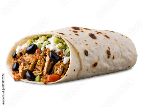 Delicious burrito with chicken, avocado, beans and soft flour tortilla