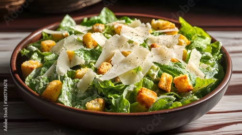 Delicious Caesar Salad in Rustic Bowl: Fresh Romaine Lettuce, Croutons, Parmesan Cheese, Creamy Dressing
