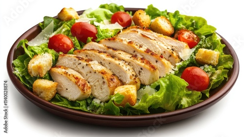 Delicious Caesar salad topped with roasted chicken breast parmesan cheese croutons and fresh cherry tomatoes on a vibrant green lettuce bed