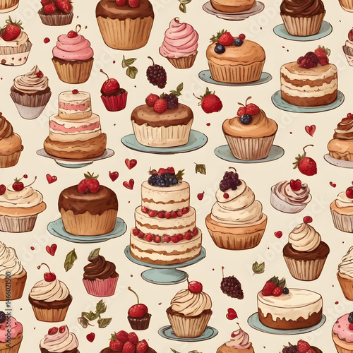 Delicious Cakes and Cupcakes Seamless Pattern Sweet Bakery Background for Design Projects