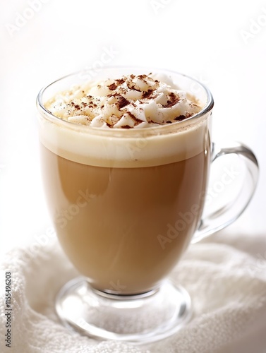 Delicious cappuccino in clear glass with whipped cream and cocoa sprinkled on top on white background : Generative AI