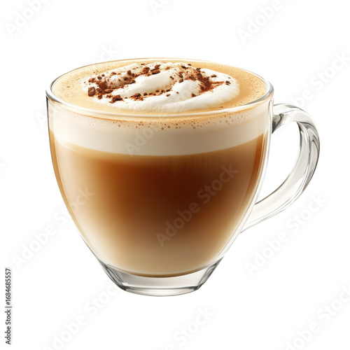 Delicious cappuccino with frothy milk and chocolate sprinkles in a clear glass mug perfect for a cozy morning or afternoon treat showcasing coffee art on transparent background