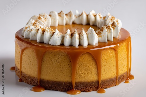 Delicious caramel cheesecake topped with whipped cream and a sprinkle of cinnamon served on a plain white background