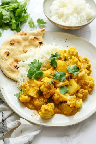Delicious cauliflower and potato curry served with fluffy rice and naan, featuring fresh cilantro on a plate in a cozy kitchen setting