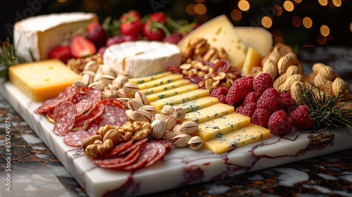 Delicious cheeseboard with cheeses, salami, nuts, and raspberries