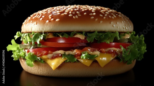 Delicious Cheeseburger with Fresh Ingredients and Sesame Seed Bun Perfect for Fast Food Advert