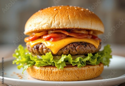 Delicious cheeseburger with fresh lettuce, juicy tomato, and savory beef patty topped with cheese and ketchup on a sesame seed bun.