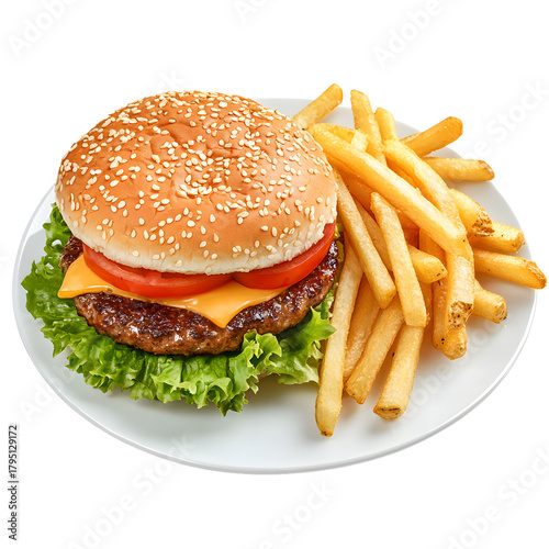 Delicious cheeseburger with fresh lettuce tomato and golden french fries isolated on transparent background