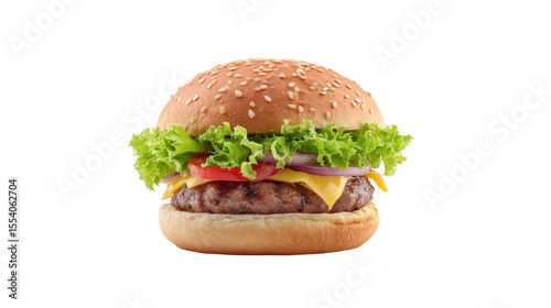 Delicious cheeseburger with fresh lettuce tomato and onion isolated on transparent background