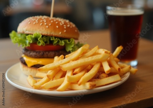 Delicious cheeseburger with lettuce and tomato served with crispy fries
