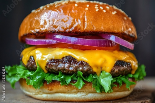 Delicious Cheeseburger with Lettuce Tomato and Onion Close Up Shot