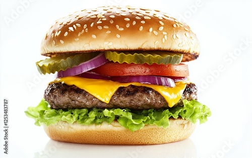 Delicious cheeseburger with pickles, onion, tomato, lettuce, and melted cheese on sesame seed bun
