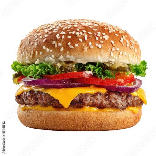 Delicious Cheeseburger with Sesame Seed Bun Lettuce Tomato Onion and Pickles hamburger fast food, Isolated On White, Png Transparent, Cut Out