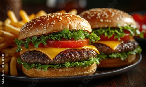 Delicious cheeseburgers with fresh lettuce, tomatoes, and crispy fries on a plate
