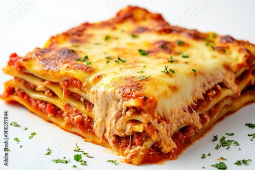 Delicious, cheesy, layered lasagna with sauce and herbs on a white surface